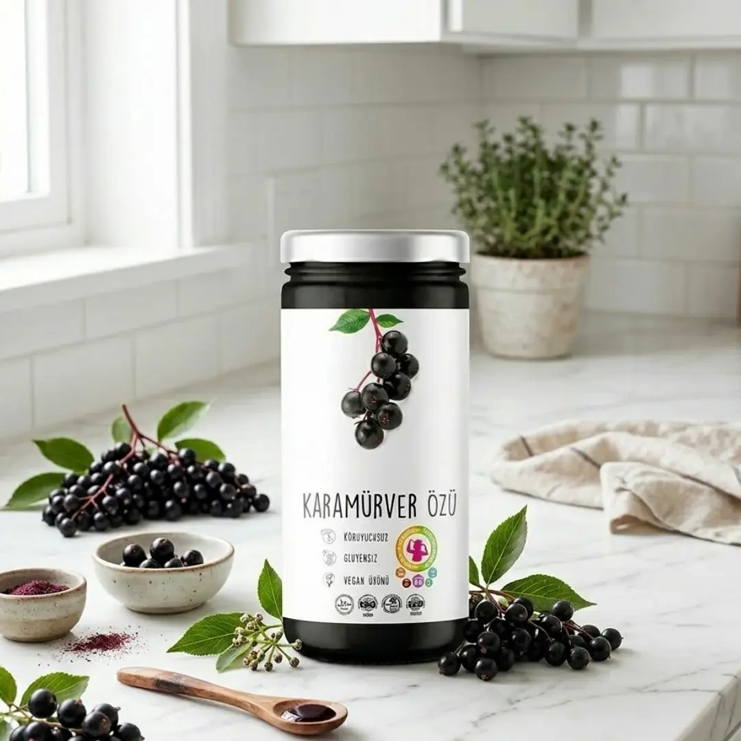 Bizim Karamürver Özümüz, taze mürver meyvelerinden üretilir, hijyenik koşullarda şişelenir ve gerçek meyve içeriğini korur.