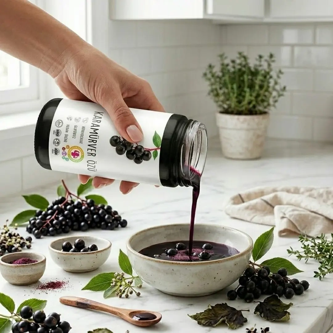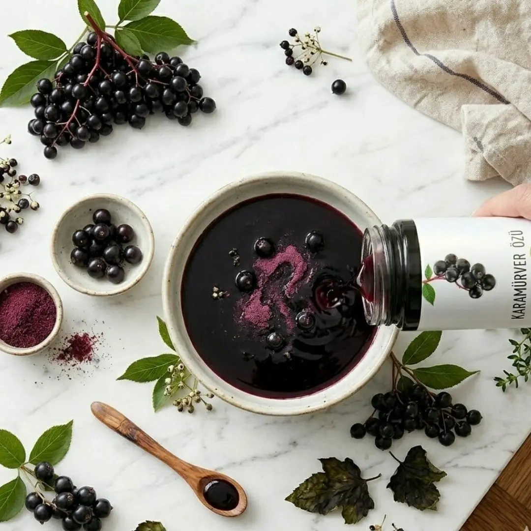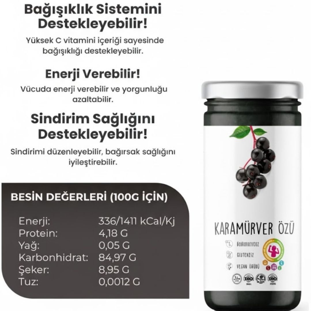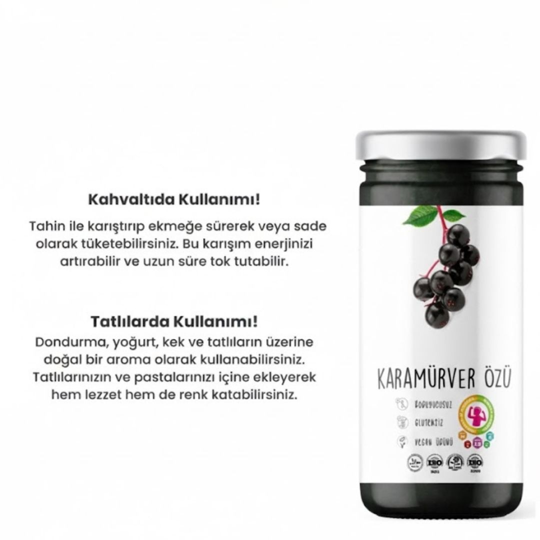 Karamürver özü, siyah mürver bitkisinin olgun meyvelerinden elde edilen yoğun ve doğal bir bitkisel özdür.